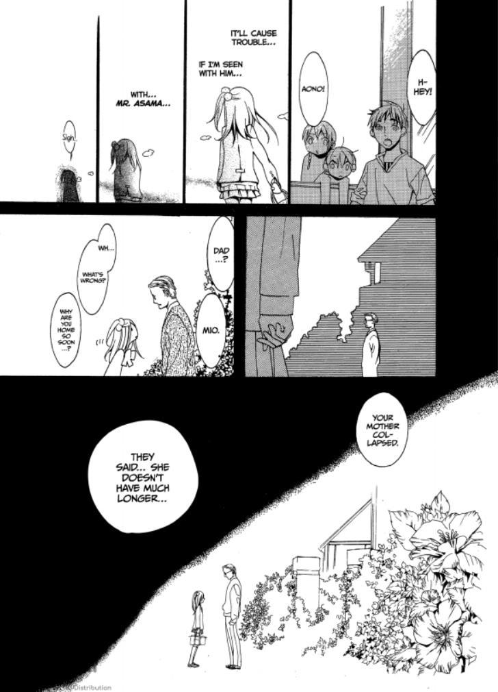 In the above page, scenes are sectioned off into three parts. The first part starts with people facing Mio, being grayed out. Mio’s internal thoughts are splayed over white background, as her body continually gets smaller and shaded in darkness, showing her emotional state as distressed and closed off. The second part gives us perspective from behind Mio as she approaches her home and sees her father against the grayed out silhouette of their house. She approaches him while asking why he’s home early. Keep in mind that both parts 1 and 2 have a theme of diagonal composition, with narrative tension rising as the visual space in the panels get shrunken down against the white backgrounds inside the panel. Outside the panels, we have deep black ink providing an ominous atmosphere and the impression that this is either a flashback, or that these events happened within a dark mental space. The final section has the last diagonal silhouette with all of the former white space now becoming blacked out, as there are no more panels, and the looming darkness has finally surrounded Mio with the revelation that her mother is close to dying. It’s very simple, but powerful composition. In animation and even live action film, “Dutch angles,” or shots with angled tilts from the camera’s perspective, are often used to disorient viewers and imply an off-kilter or confused headspace. The use of negative space on a comic page to recreate that same feeling of disorientation a film can give with a Dutch angle is very intuitive, maybe even genius! It shows that Uta-sensei has an astounding sense for composition, even before becoming a professionally serialized artist. I’ll also say that besides that knack for composition and use of tones, I’m also a huge fan of the use of flowers and plants for introductory panels that show the next step in Mio’s life–it gives a distinctly shoujo manga feel that I appreciate.