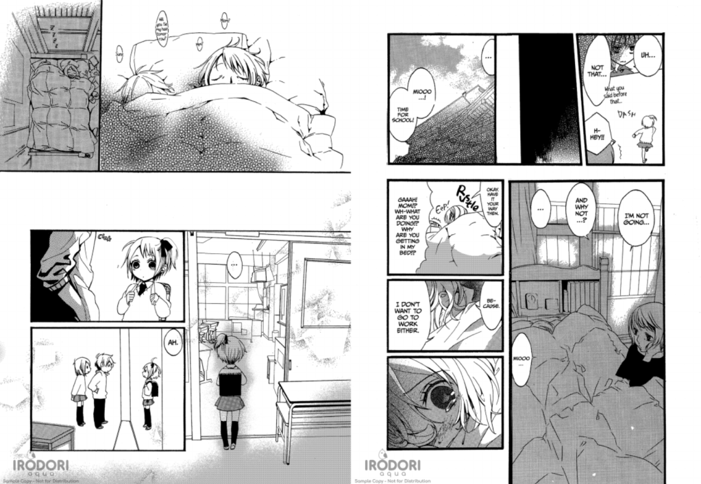 What really stands out to me in this story is the way that time’s passage is shown to us, not told. Mio’s early years are defined by an emotional immaturity that can’t keep up with everyone else aging around her. She enters kindergarten and after making her first friend, can’t follow him into later grades because her mental faculties are literally aging too slowly to keep up. It’s a trend that follows her through middle school and high school. The bonds she forms with other children she befriends all end up hurting her, because her condition as a Leaper does not allow her to progress through the school system as intended for “normal” people. It leads to her getting bullied, something many kids experience whether personally or peripherally, because of the nature of compulsory schooling and children learning how to socialize… I think that the progression of Mio’s childhood being concisely broken down into the most important memories she made, makes for really good storytelling. Because Leapers are technically experiencing four times the events in the span of a single “biological” year for them, they are quite literally experiencing life in slow motion or fast-forward, depending on how you think of it. We barely retain any memories of infancy or childhood as we age, and it makes sense that Mio’s most important memories are the ones where she experiences what it’s like to be human–forming relationships with others. One of my favorite sequences is Mio staying in bed, the morning after her confrontation with Takumi, who (perhaps unintentionally) sparked the bullying episode. After her mother asks why she doesn’t want to go to school, she ends up joining her in the bed, saying that she also doesn’t want to go to work. It’s an incredibly tender and heart-wrenching scene, because as an adult, it’s not easy at all to shrug off responsibilities. But Mio’s mother clearly loves and cares for her and her emotional well-being. It was clear from the page after she gave birth, but she would not abandon her daughter just because she grows differently from what is considered normal.